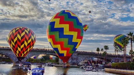 In January 2026, I visited Lake Havasu, known for the reconstructed London Bridge. The region hosted a hot air balloon festival with ideal conditions for aerial photography. Balloons launched over the bridge, with pilots aiming to touch the river. Notably, the event featured unique shape balloons and stunning evening displays.