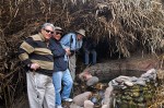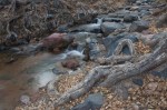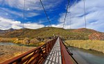 We took Cave Creek Road east and branched north toward Seven Springs on FR 24. At the junction with Bloody Basin Road we took FR 269 about 12 miles to the Sheep Bridge over the Verde River. The original suspension bridge was built in 1943-44 for $ 7,277. The walkway is 476 feet long and three feet wide. The purpose was to enable to sheep herds, owned by the Flagstaff Sheep Company, to be moved from one side of the river to the other (from high country pastures to low desert pastures). Previously fording the river was dangerous and resulting in losing several sheep each time. In 1978 the bridge was entered in the National Register of Historic Places. The old wooden bridge weakened by time and flooding was disassembled in 1988. In 1989 the current bridge was built. Below the bridge hiding in the bulrushes is a hot spring (90 degrees) contained in a stone and cement pool about the size of a hot tub. After leaving the Sheep Bridge, we made a short drive down Red Creek, literally driving in the creek over and around various boulders. We then traveled Bloody Basin Road to I 17.