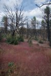 As we continued down Peck Mine Road, we came upon and old corral, always a good source of old textured wood photos.  Then we entered a former forest fire area, maybe 1-3 years since the burn, with a half mile stretch of the most beautiful pink grasses which looked like cotton candy.  Further on we came across several road wash outs.  The first we easily went around.  The second was more serious and 50 feet deep, after the first SUV was leaning severely, we dug away part of the bank and raised the lower level with rocks for the second vehicle.  Finally, we thought we were home free but encountered a very steep embankment within sight of the final road.  We did not make it up the bank, but found an easier way around about 100 yards down stream.