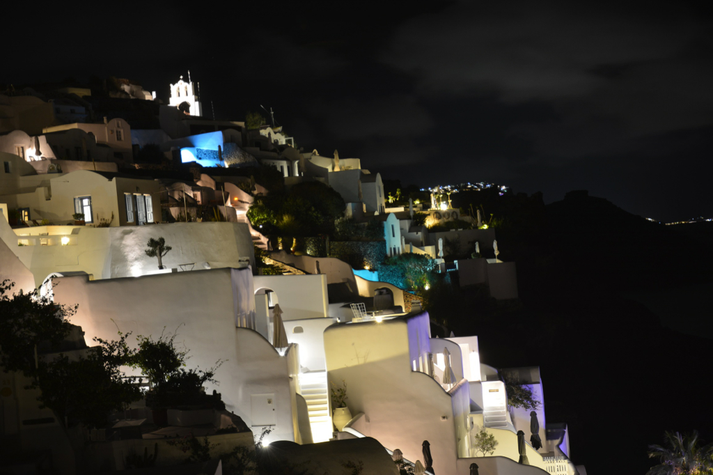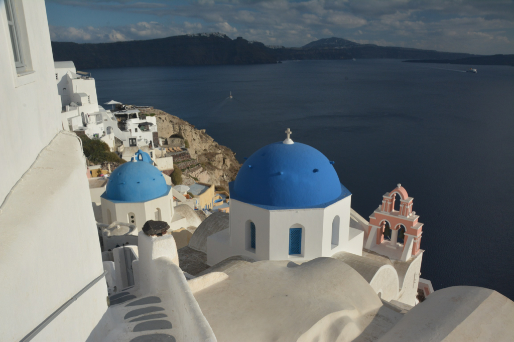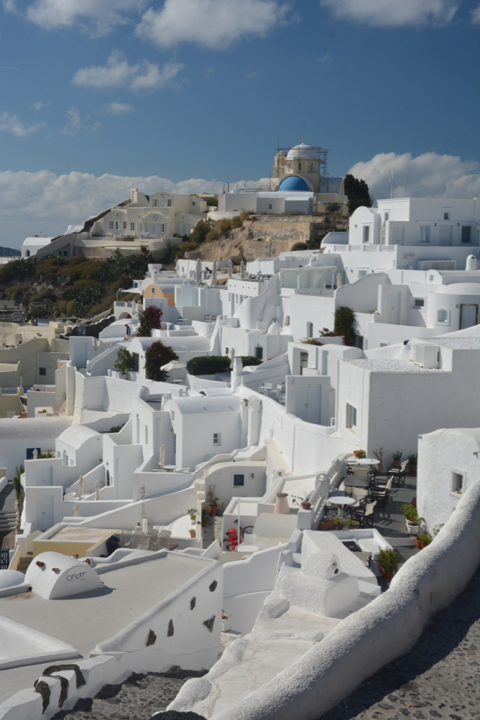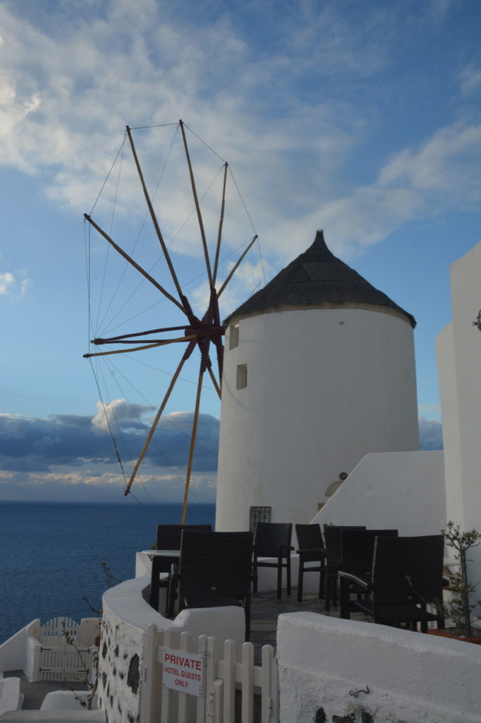 We stayed overnight right across from the airport in Athens as we did not make a connection in London on the previous day. We flew out to Santorini on Monday morning and found Aspa Villas right on the caldera side of the island in Oia. Oia is right along the cliffs of the dormant volcano. The volcano last erupted very violently in about 1450 BC and destroyed the Minoan civilization. Most of the island sank into the caldera. The villas and houses are almost on top of each other as you can see in the photos. Most of them are painted white which has the overall effect of almost blinding you in the sunlight. We walked the whole length of the pedestrian walk with all of the shops (Joann did not buy anything. Yet!) and many photo stops. Finally at the end of the walk was one remaining windmill. Oia is famous for the sunsets but did not pan out tonight.