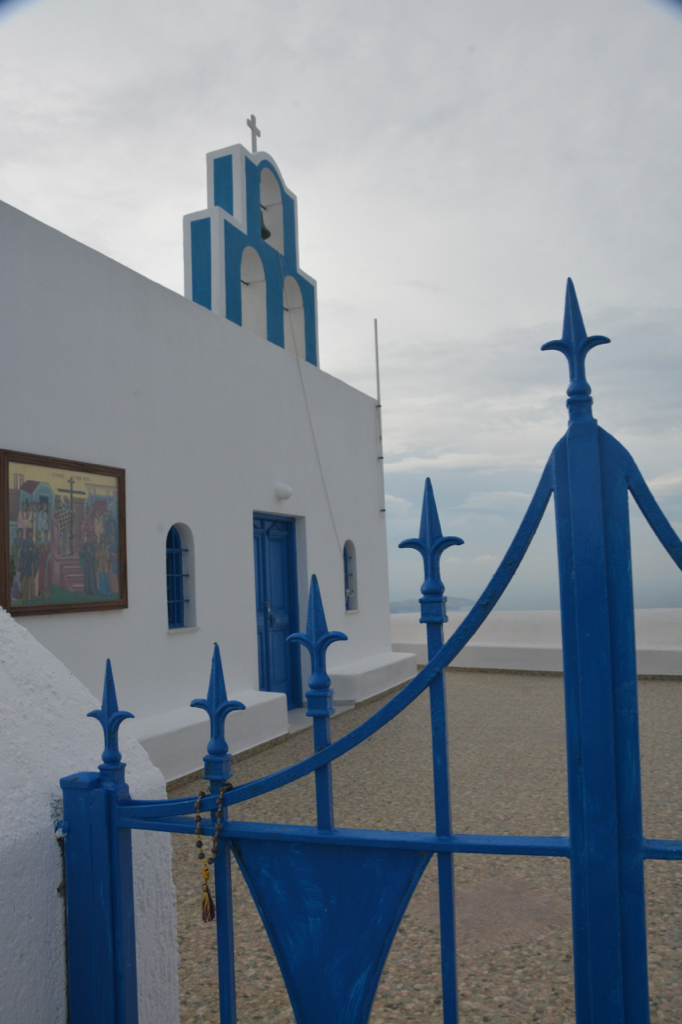 Early morning was pretty well socked in with clouds – so no spectacular sunrise. Colors in the morning was rather muted. We decided to take the bus to Imerovigli and walk on the path halfway down the cliff to Fira. This walk was great for taking lots of images of scenics and also some details. We had a great view for lunch of crepes and could see all the way back to Oia on the tip of Santorini. The villas on the sides of the steep volcanic walls are really a sight to behold. Many churches – most with blue domes, are very numerous all over the island. The Fira shopping district was very crowded as there were three cruise ships in port. There are three modes of travel from the cruise ships – walk, ride a donkey, or take the aerial tram. In the afternoon we were back to our villa in Oia for a short rest. Then we took a late afternoon walk through Oia for shopping, watching the sunset, and finally dinner.