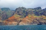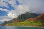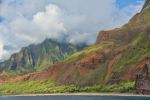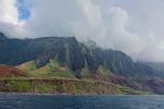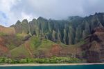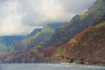 We took the family to Kauai for our 50th Anniversary and stayed in a fabulous ground floor condo at Lae Nani, right on the beach. With three grand children much of the time was spent at beaches – snorkeling and surfing. I will spare you from those photos. Kauai is generally know as the “Garden Isle” because of the lush vegetation and agricultural produce. It is the northern most island in the Hawaii chain and the first to form from an undersea volcano. The volcanic peak remnant is 5148 feet high. Up to 460 inches of rain per year have carved many deep canyons – Waimea Canyon is over 3000 feet deep. Much of the time the canyon is covered in clouds. The first sugar can plantation was established in 1835. Sugar cane has been replaced with coffee plantations, the largest is 3,400 acres. The photos are almost all from a sunset cruise along the Na Pali coast on the northwest side and the Waimea Canyon, known as the Grand Canyon of Hawaii. I was blessed with great lighting for both places.