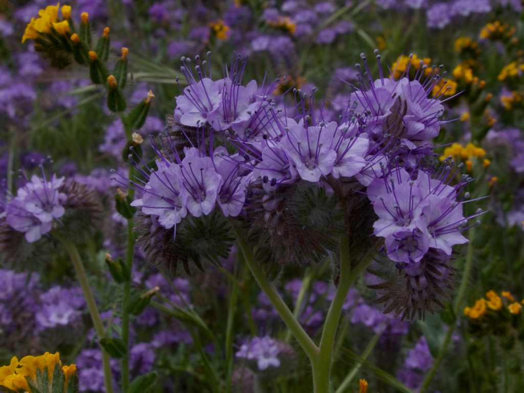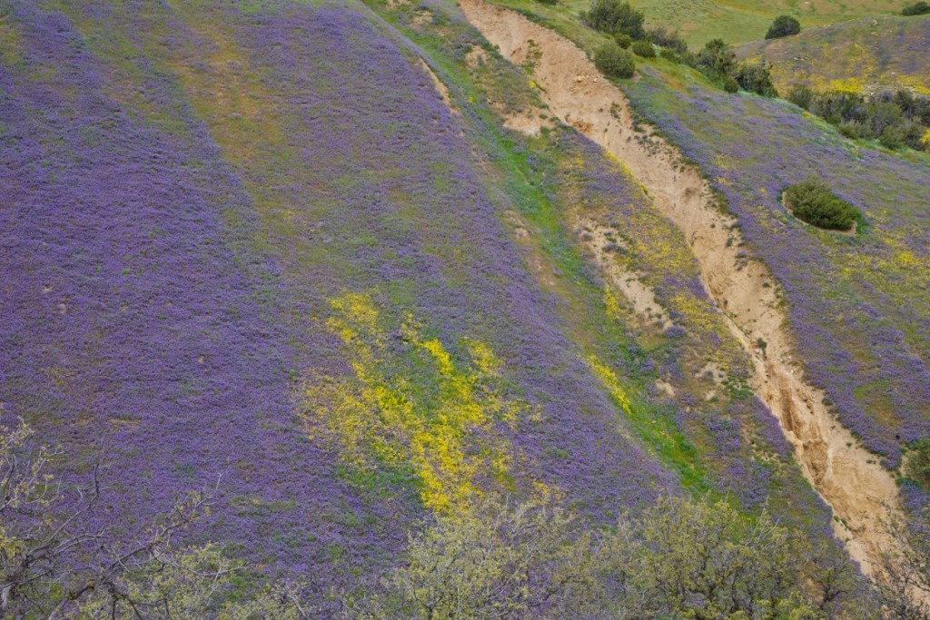 In this section, along steep winding roads, we came across fields of purple. The last photo is a up close look at the scorpion weed that makes up the purple colors. Mixed in is the small yellow flowered fiddle neck, which later we will see in muted fields of slight yellow color. Both types of flowers have a curled over part that is ready to open for more bloom, hence there names. In Arizona the scorpion weed is three times smaller in both flowers and height.