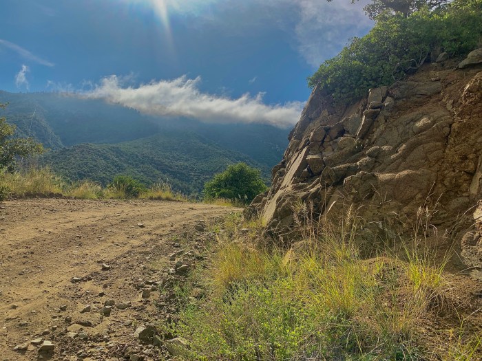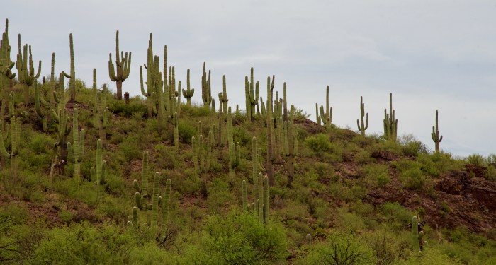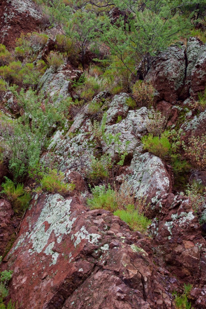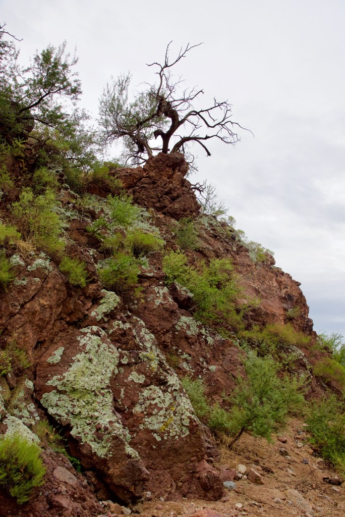 Before we make the ascent, we travel a route down a wash near Oracle that contained steep sides made from a sandstone conglomerate rock that had many large stones imbedded. This shows the violent surge of water long in the past in the formation of this type of rock
