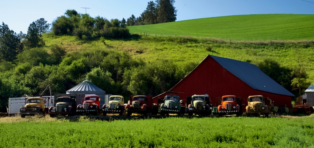 We stayed at a KOA on the Snake River at Almota. It was quite a steep drive on Route 194 in and out of the Snake River Canyon. This morning I continued north on Almota Road toward Diamond and Endicott. First up is a nice red barn with a windmill nearby. From a higher view point you can see the extent of the wheat fields in the rolling hillsides. The last photo is of a row of trucks on one farm. The woman farmer said I should get off the road and park in her farm yard, but be careful not to trample the alfalfa in front of the trucks. In the end I did not do that as I had already taken quite a few shots of the trucks and I was parked off the road and was walking on the edge.