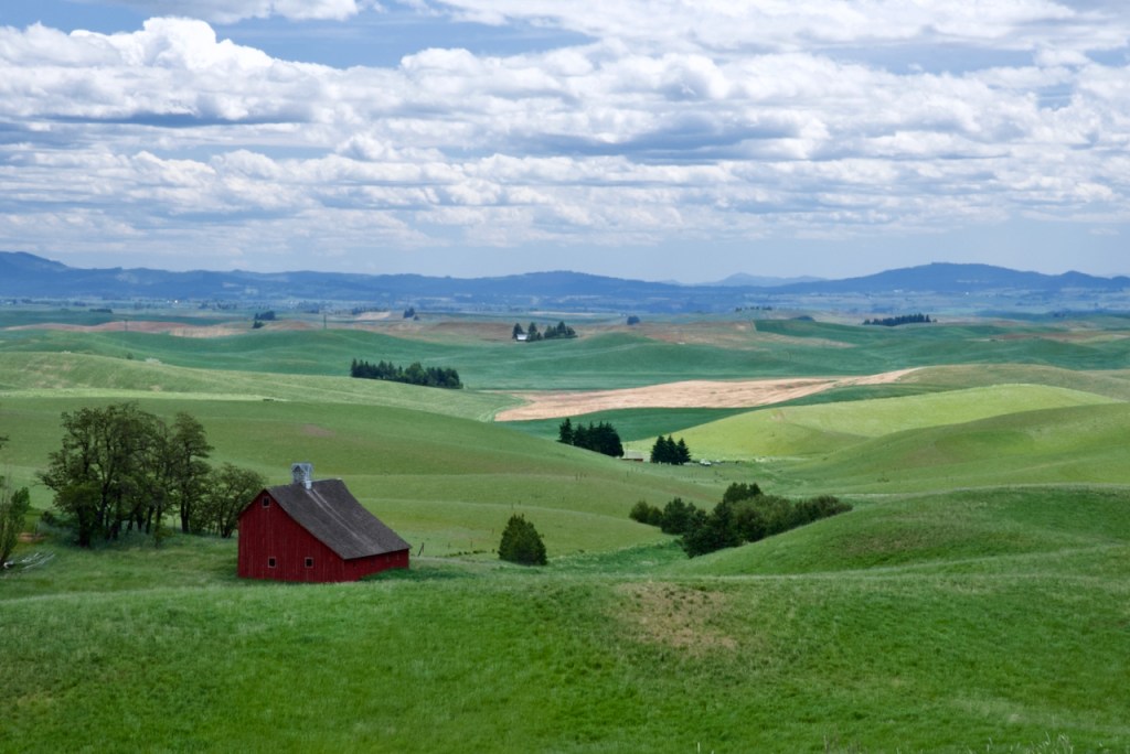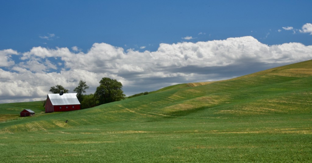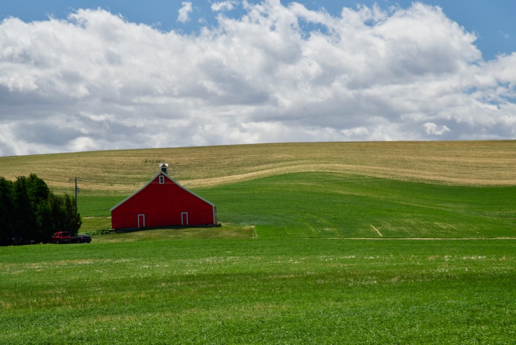 The next photos were taken on several roads leading off from Route 95 south of Moscow, ID. It was a glorious day with the white cumulus clouds. I was lucky to find some high viewing spots for these barns.
