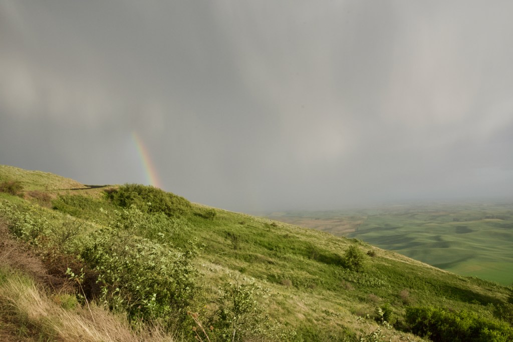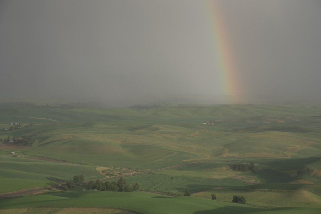 As we drove up Steptoe butte, the rain showers were coming in from the west. Initially there was a partial rainbow that lasted for quite awhile. We did not get much rain, but the sky was filled with the haze of rain. Towards the end we did get some dramatic clouds in the east that were lit by the sun setting in the west. We then had about an hour drive in the dark to our RV park in Idaho which we reached at 10 PM. It was a glorious long day for us, but well worth it in terms of photographic opportunities as you never know what the weather brings.