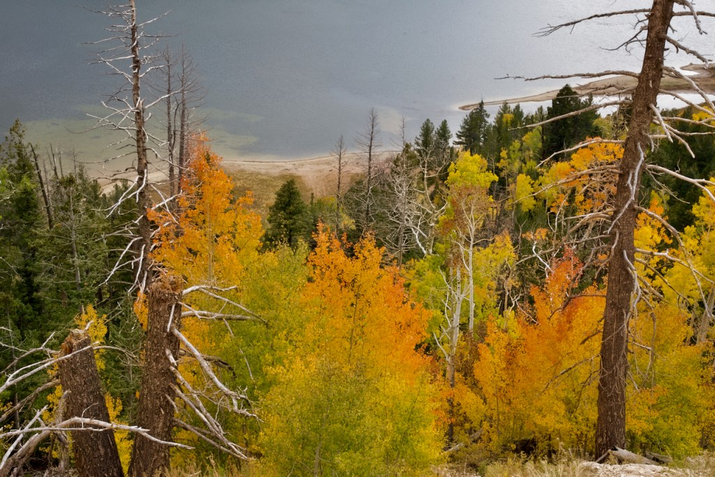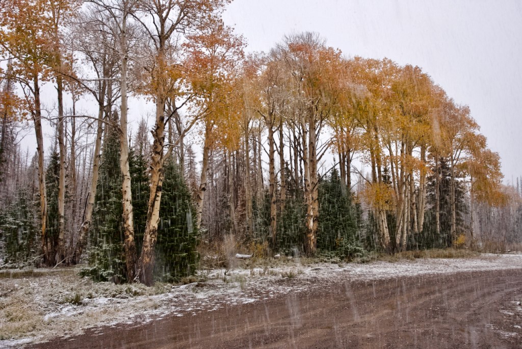 As we crested the mountain and started heading down at Brian Head Ski Resort the snow was already tapering off. I was surprised to see a 13% grade down the mountain toward I-15 and wonder how the ski people climb the road in the winter. I stopped for one shot of the aspens making a comeback in a burnout area.