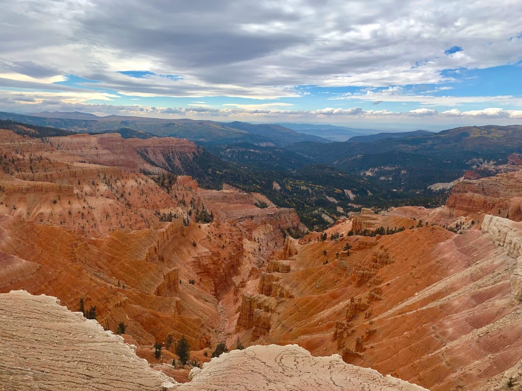 The first photos of Cedar Breaks National Monument are a continuation of October 7 day on Route 14 and then Route 148 to see several viewpoints of Cedar Breaks. This is a lesser known area and near the more well known Bryce Canyon. Cedar Breaks is at an elevation of over 11,000 feet and is the last visible out crop of the Colorado Plateau. The Colorado Plateau starts on the south at the Mogollon Rim in mid Arizona and includes the Grand Canyon, Arches, Canyonlands, Capital Reef, Grand Staircase Escalante, Bryce, Zion, and Cedar Breaks – actually 9 National Parks and 18 National Monuments. The rocks are mostly sandstone (with a lot of red from iron oxides -rust) with some volcanic rocks mixed in and aged 2 billion years old in the depths of the Grand Canyon to 700 million years old to 50-60 million years old in the upper layers. The sandstone was laid down in vast seas which covered the area.