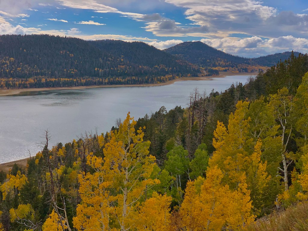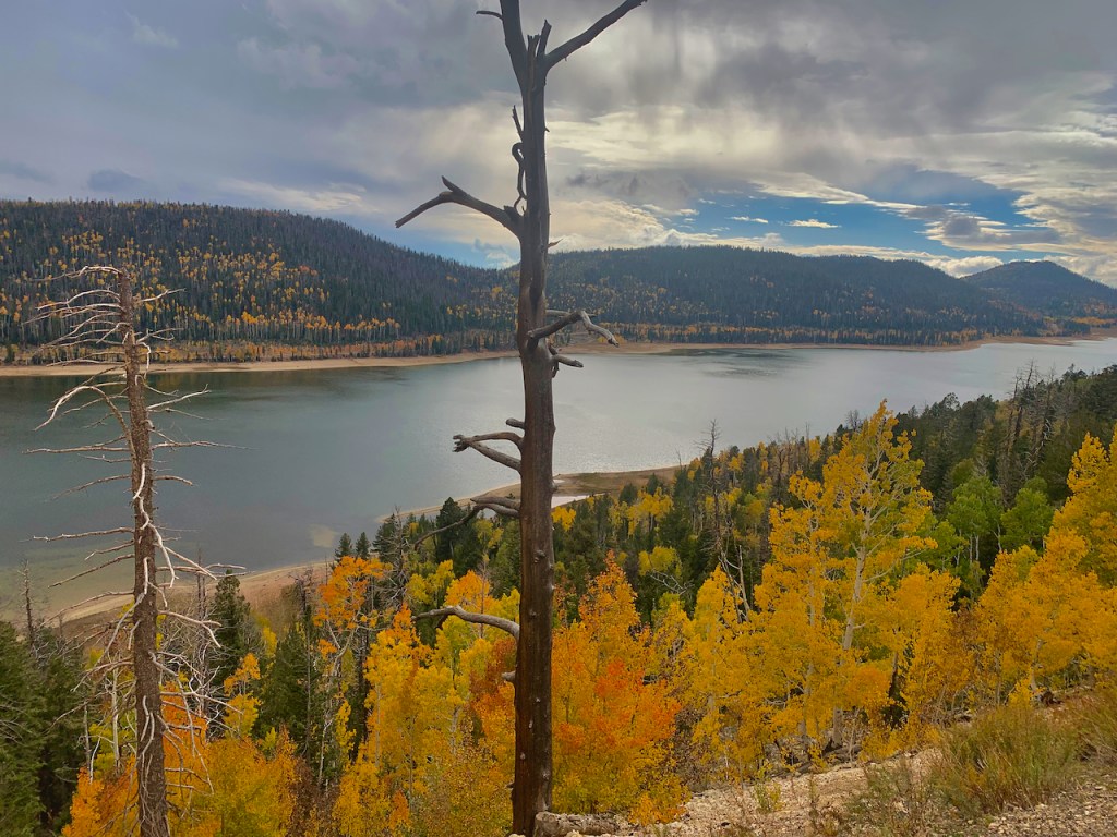 Oct. 8: This morning was cloudy with rain forecast all day, but the search for fall color must go on anyway. This time we headed back up to Cedar Breaks on Route 143. We drove all the way around Panguitch Lake and did not find much color, but a lot of fog