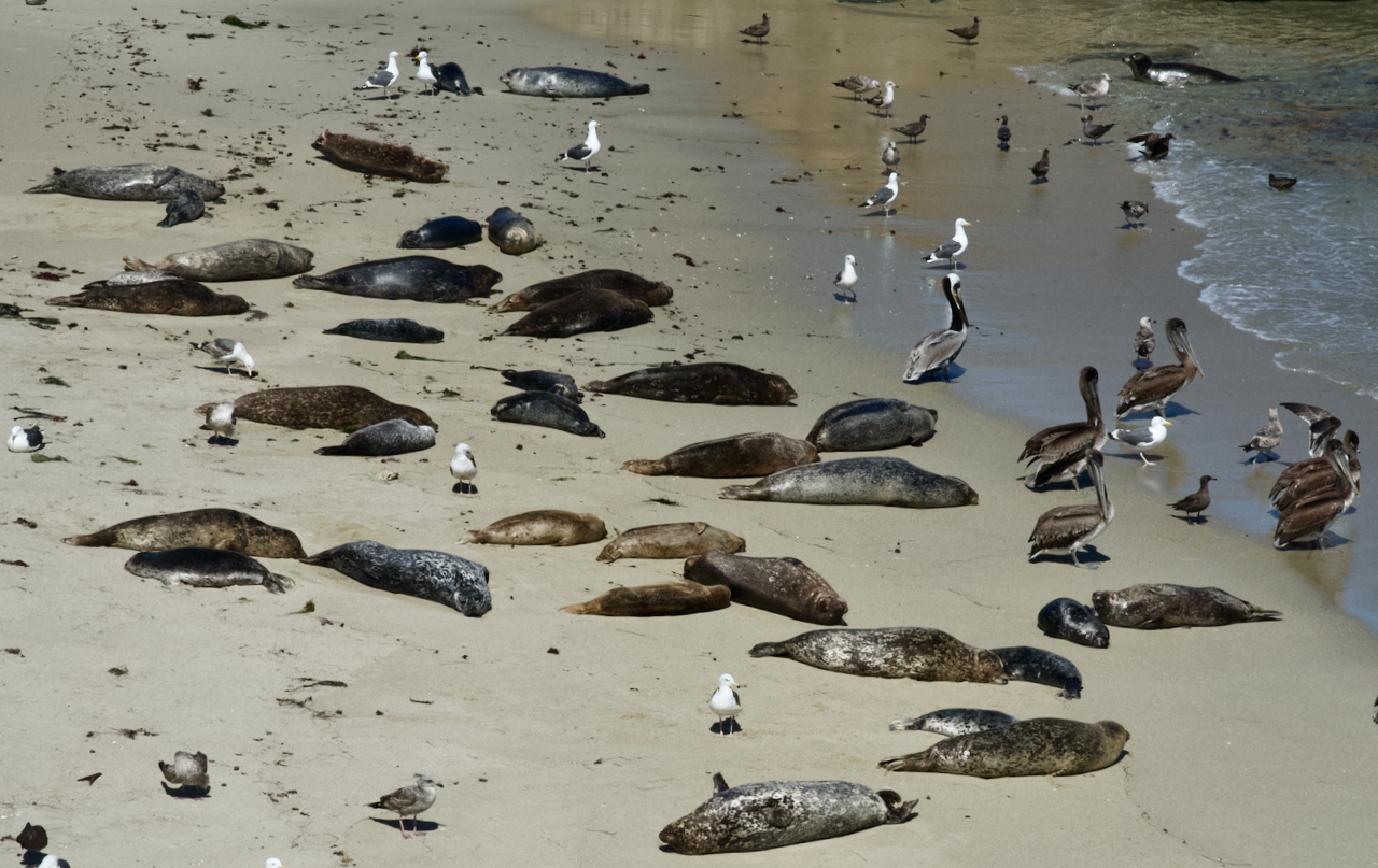After that encounter we got up on the beach side walk and looked down to find very many seals with babies lying on the beach and brown pelicans. With my long lens I was able to get some good photos.