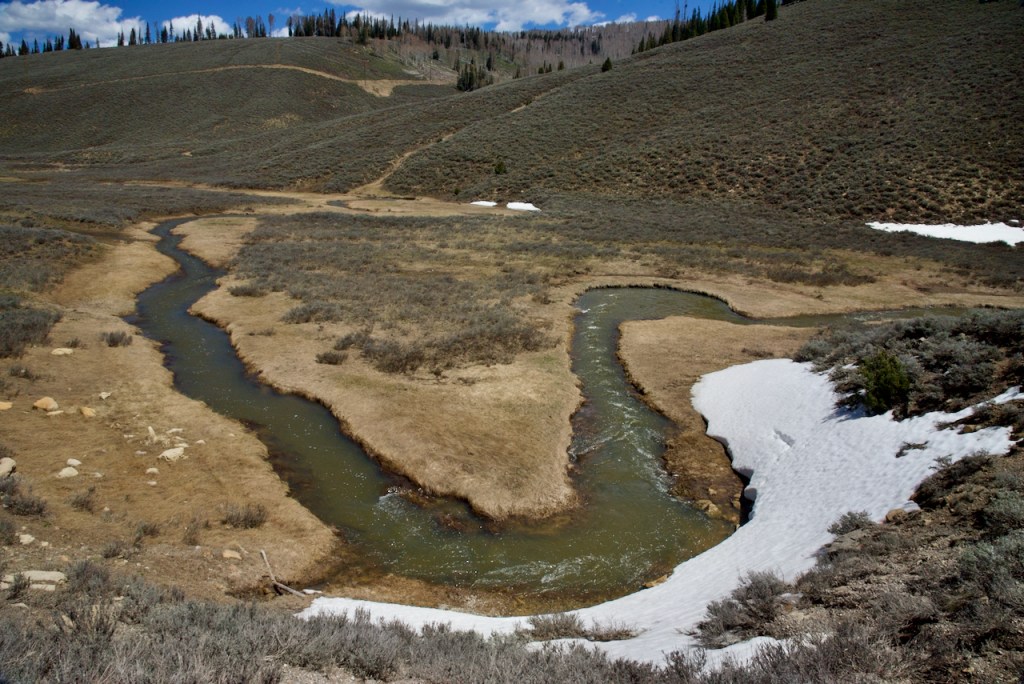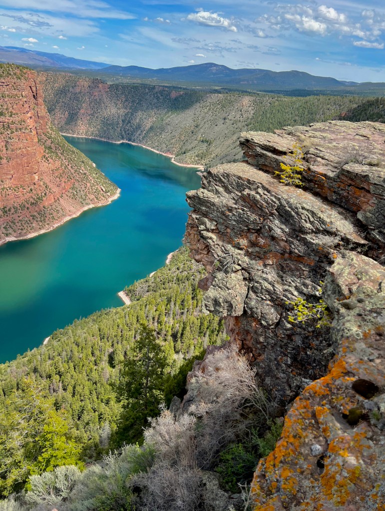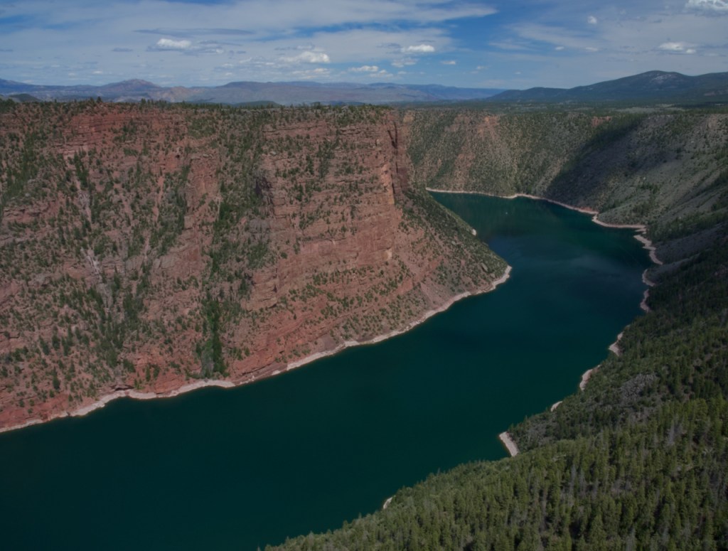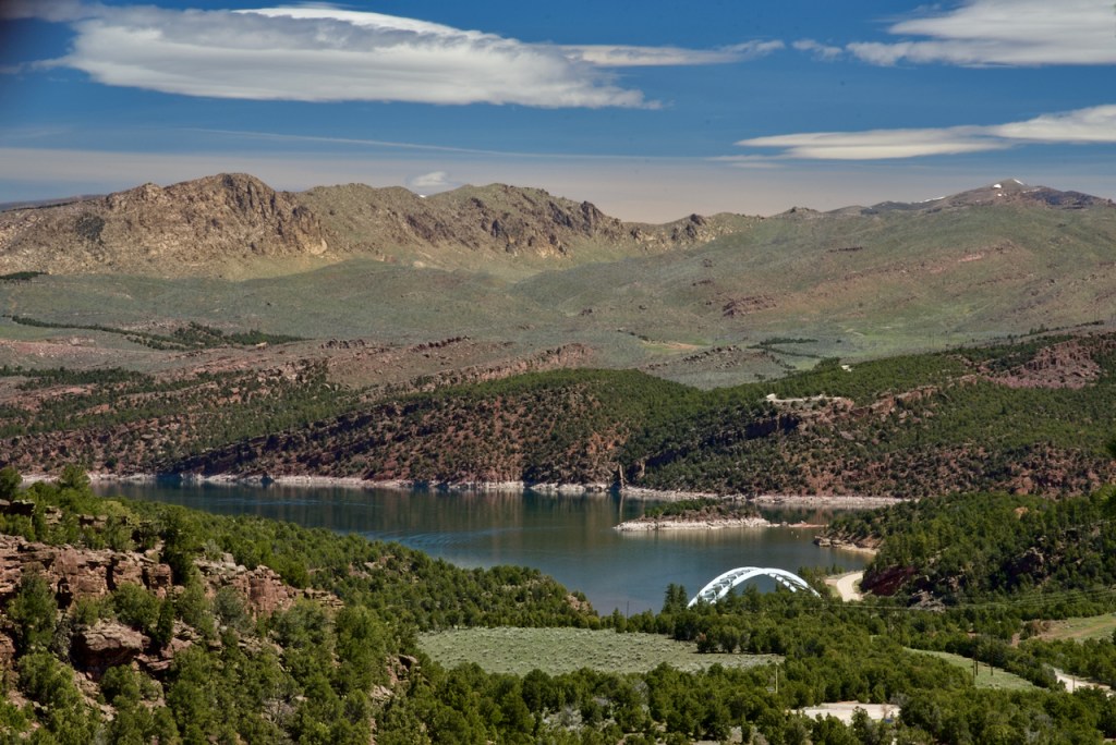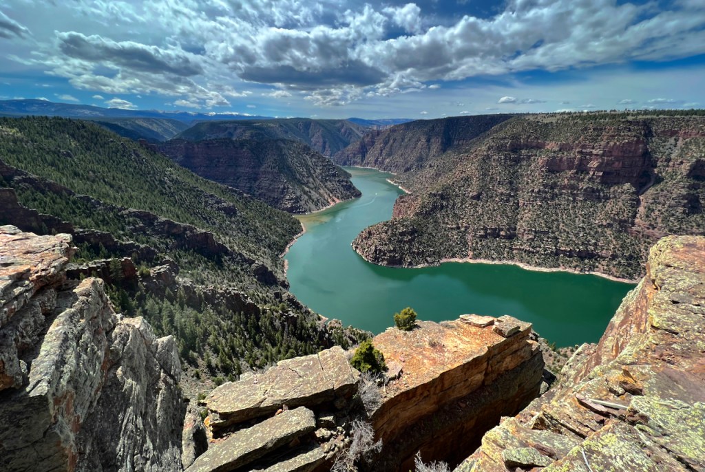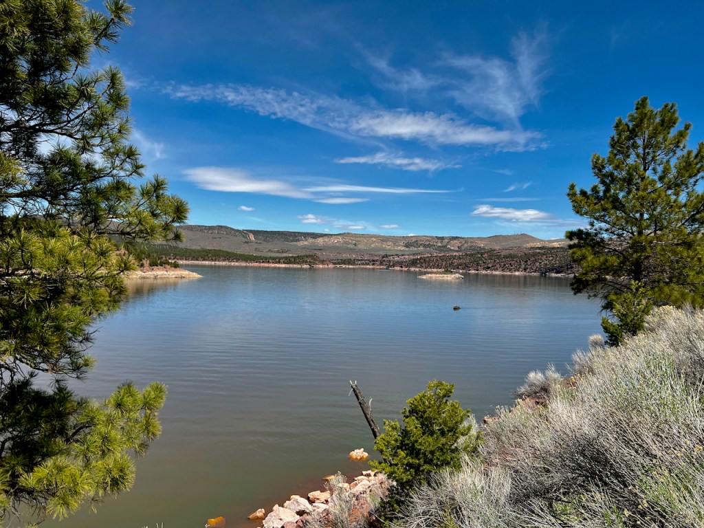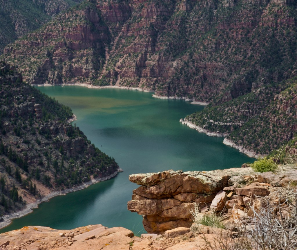 There are potentially quite a few view points, but we only had time for one of them with a visitor center which was closed. You might wonder how Flaming Gorge got its name – Think Powell – “It enters the range by a flaring, brilliant red gorge, that may be seen from the north a score of miles away. The great mass of the mountain ridge through which the gorge is cut is composed of bright vermilion rocks; but they are surmounted by broad bands of mottled buff and gray, and these bands come down with a gentle curve to the water’s edge on the nearer slope of the mountain. This is the head of the first of the canyons we are about to explore—an introductory one to a series made by the river through this range. We name it Flaming Gorge.”
