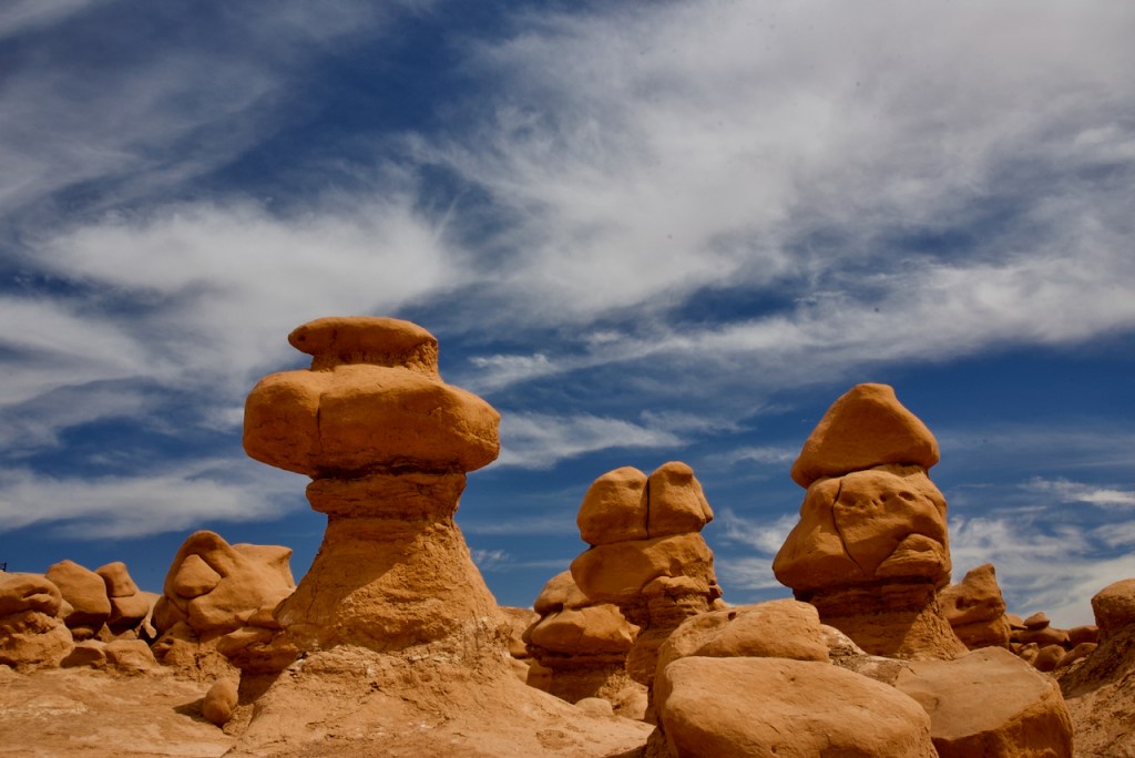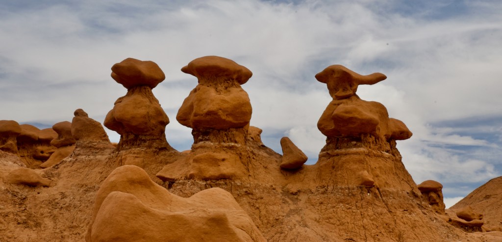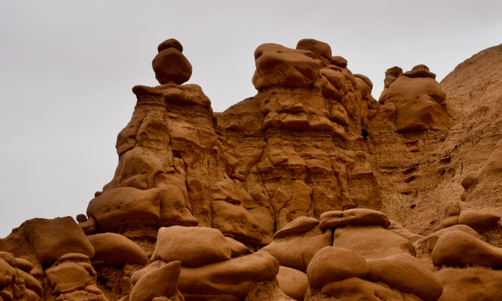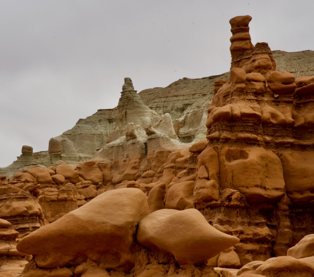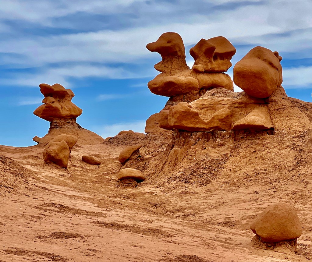 The next day we headed further south to the warmer red rock and desert country. About 40 miles south of Green River, UT, we drove to Goblin Valley State Park. From deposits formed 170 million years ago by a vast inland sea, thousands of uniquely shaped stone goblins are formed by water and wind erosion. The capstone rock is harder than the underlying rock which erodes faster and hence the shapes. You can use your imagination to find shapes of all sorts of things.