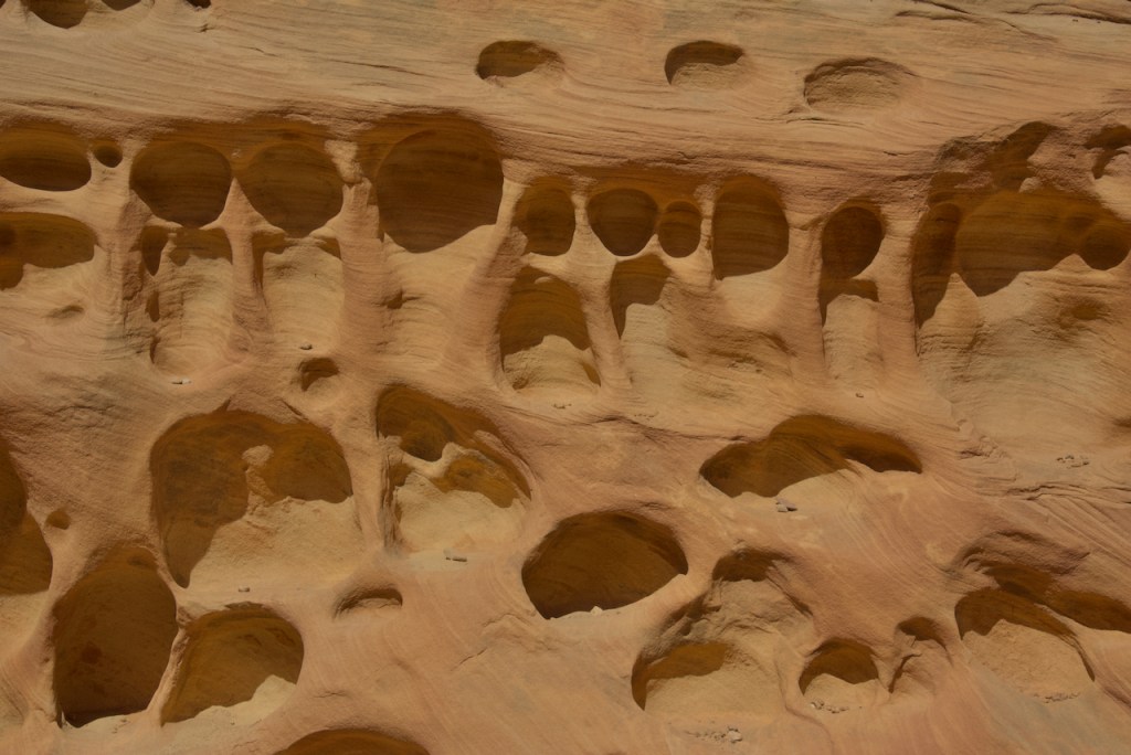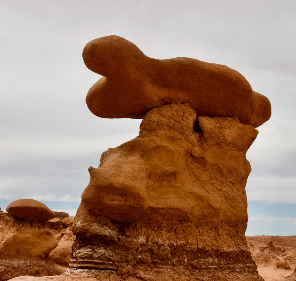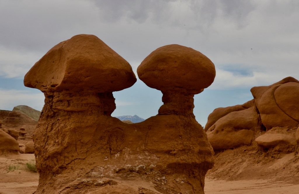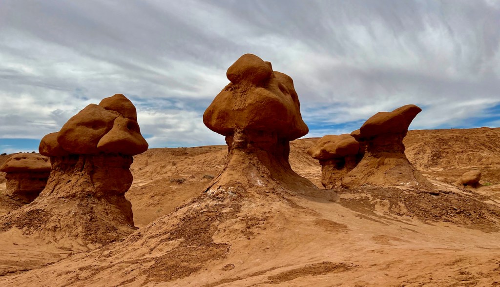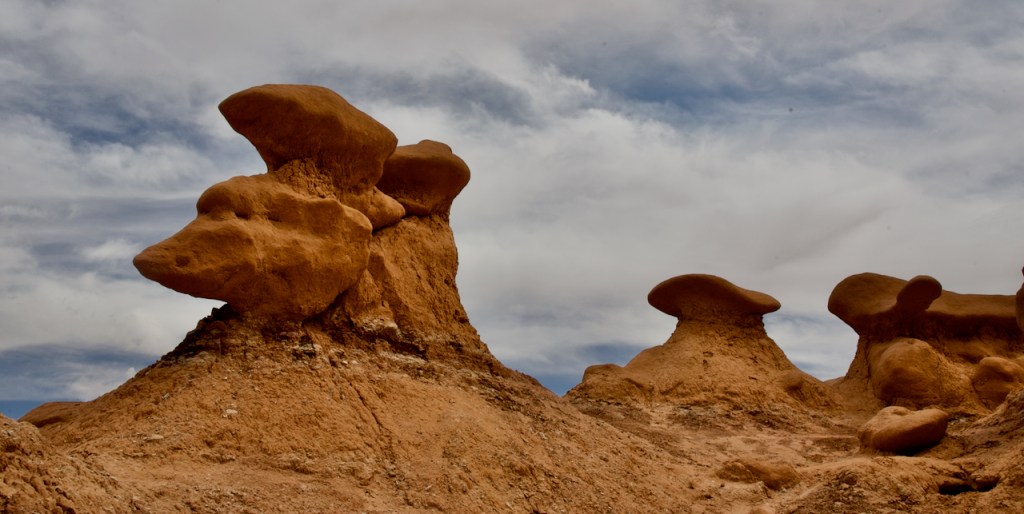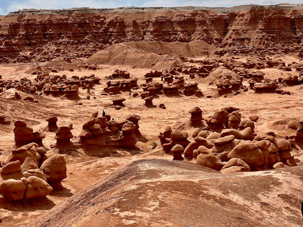 The next day we headed further south to the warmer red rock and desert country. About 40 miles south of Green River, UT, we drove to Goblin Valley State Park. From deposits formed 170 million years ago by a vast inland sea, thousands of uniquely shaped stone goblins are formed by water and wind erosion. The capstone rock is harder than the underlying rock which erodes faster and hence the shapes. You can use your imagination to find shapes of all sorts of things.