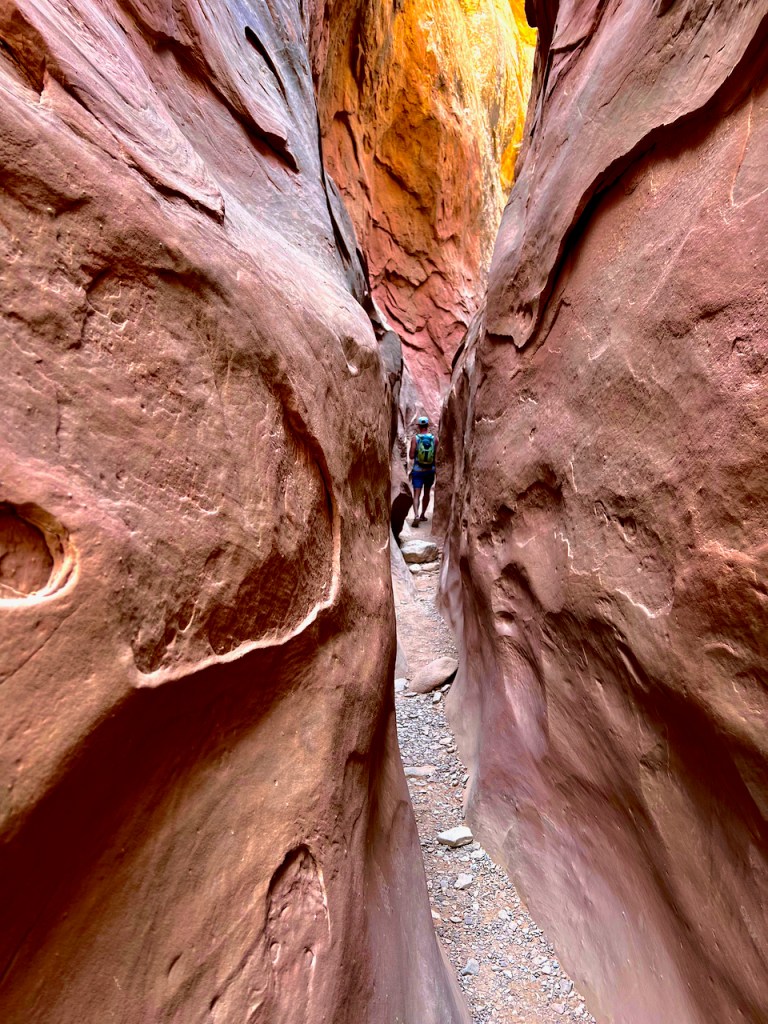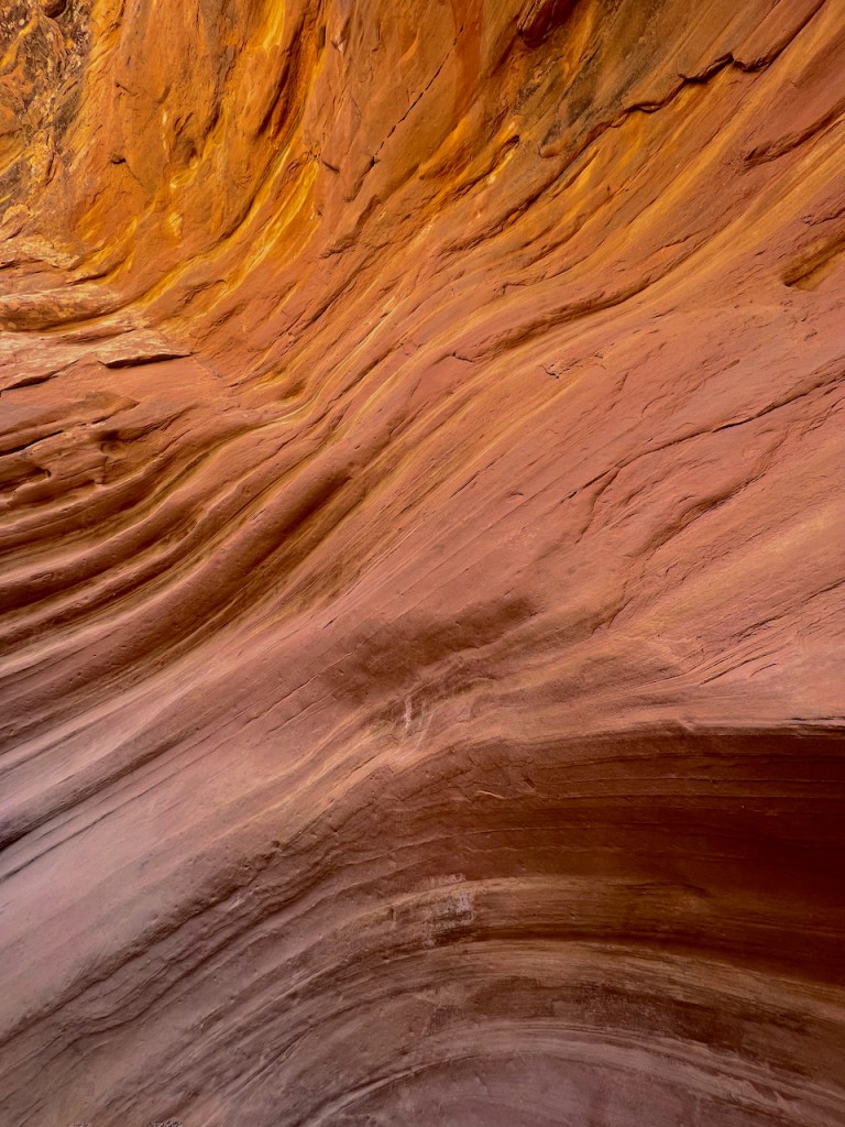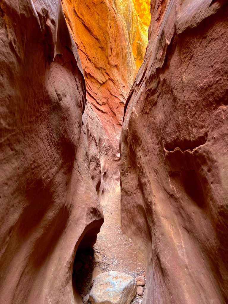 Then with more hiking, I came to two different waist high rocks to climb to continue and almost turned around, but glad that I did not. The reward was great for what I was looking for. In some places the bottom was less than a foot wide and you had to walk on a slant guiding with your hands on the walls. The photos are taken with an iPhone 13 because it can readily deal with low light exposures because of the built in HDR processing in camera. I was happy to find a good section totally in shade as sun lit photos do not yield the same colors.