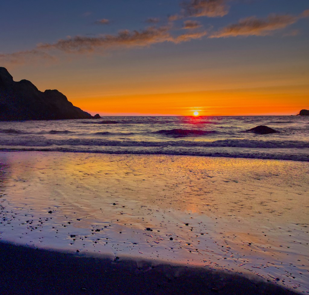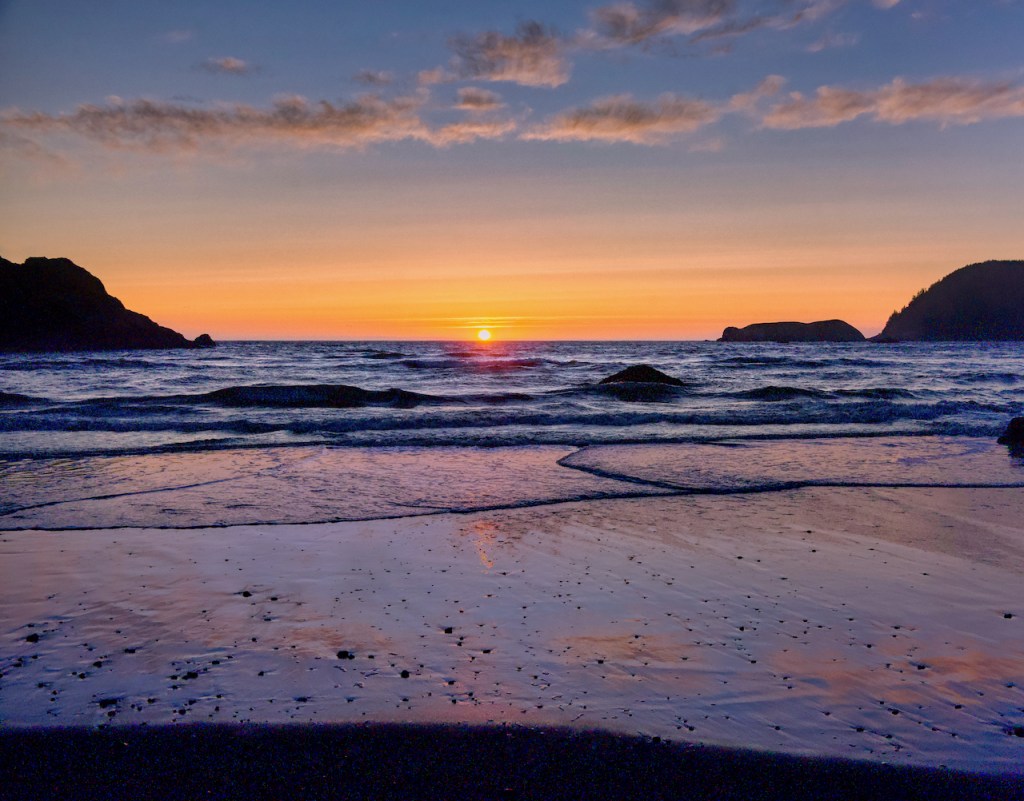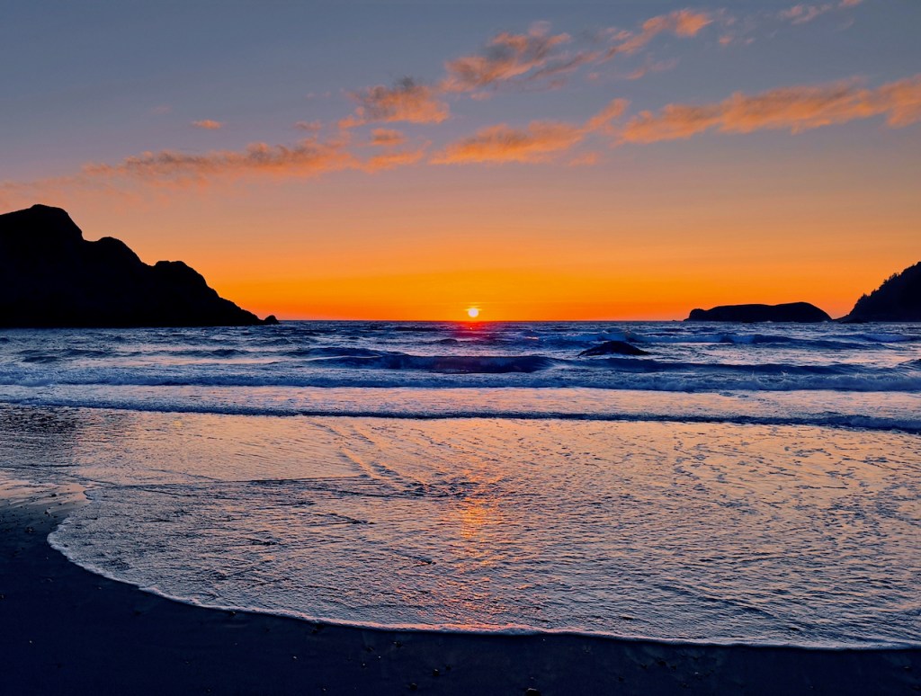 I finally got a fairly good sunset south of Gold Beach at Meyer Creek State Park. I even was able to make the hike down to the beach level. Some of the photos are enhanced to bring out as much color as possible.