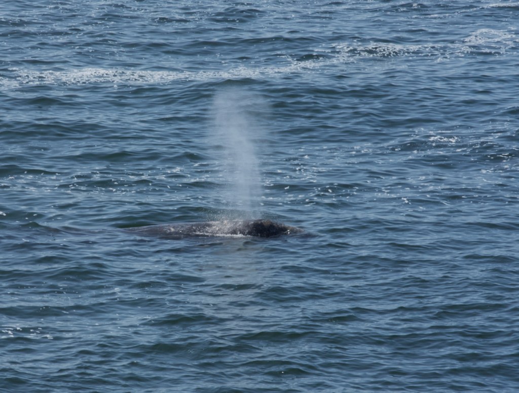 I saw a whale near shore blowing air with just a little of its back showing and pretty far out.