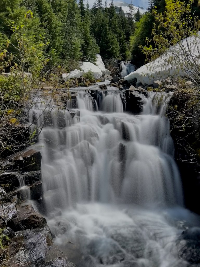 I drove part way up the Sunrise road until it was closed and crossed a series of creeks and found waterfalls along the way. First waterfall is Cougar Falls, Mount Rainier. Last waterfall is Sunbeam Creek Falls. How about the snow banks in mid June?
