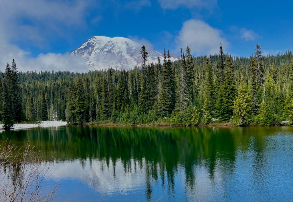 My final stop was at Reflection Lake where hordes of the other people were also stopped. The main lake had rippled water so no reflection of Rainier and it was also in and out of the clouds. As I drove up I noticed a smaller lake just up the road and walked back to it to get the best reflection shot that I could get. Of course I have many more.
