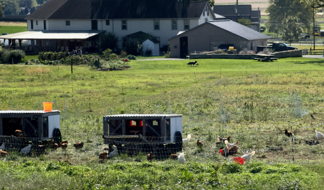 I was able to photograph at a distance some of the farm activities. They are allowed to have tractors if they have steel wheels. Then there are chickens in small coops. The fourth photo I do not recognize the type of equipment. The final photo is a “drill” used to plant winter wheat in rows that are closely spaced.