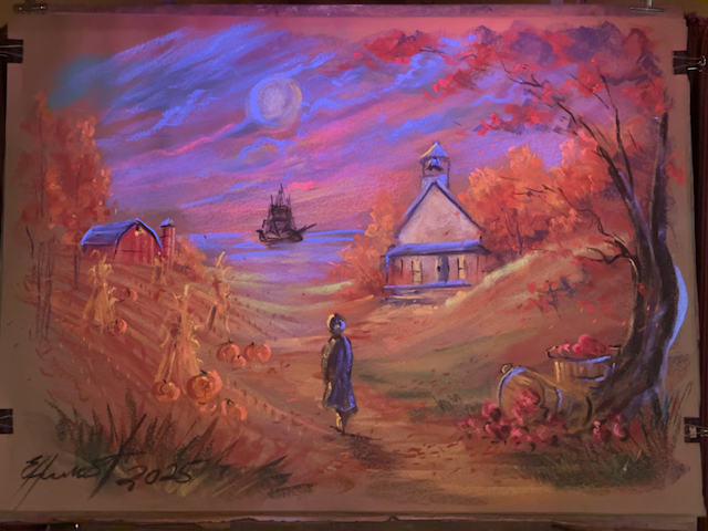 The final stop was at the farm barn art studio of Elva Hurst. She did the Chalk talk art work in about 25 minutes. It was quite an experience to listen to her story growing up as a Mennonite and becoming an artist. The first photo she did “live”, the second was in the studio.