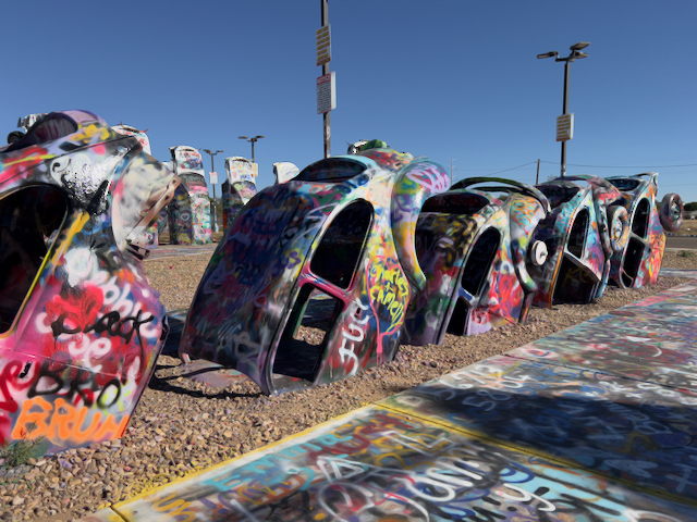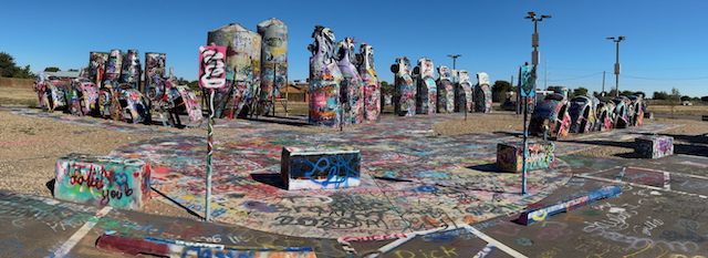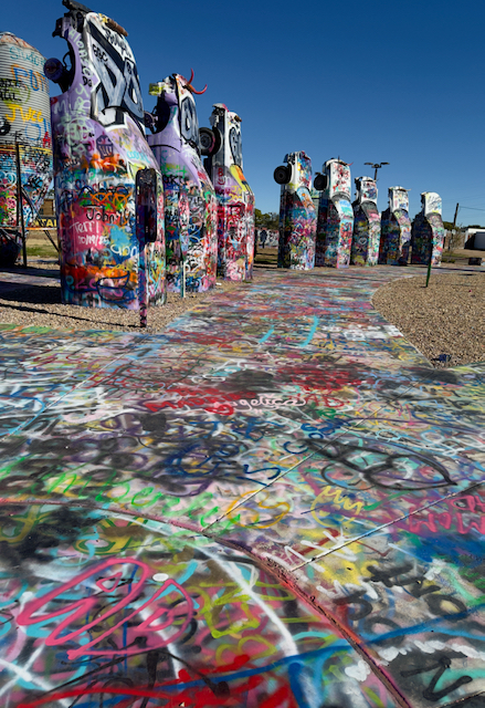 There are now two places where there are buried old cars and graffiti is encouraged. Cadillac Ranch west of Amarillo, Texas where I have never stopped. I stopped on the east side of Amarillo at Slug Bug Ranch, newly recreated and featuring some VW bugs as well as Cadillacs.