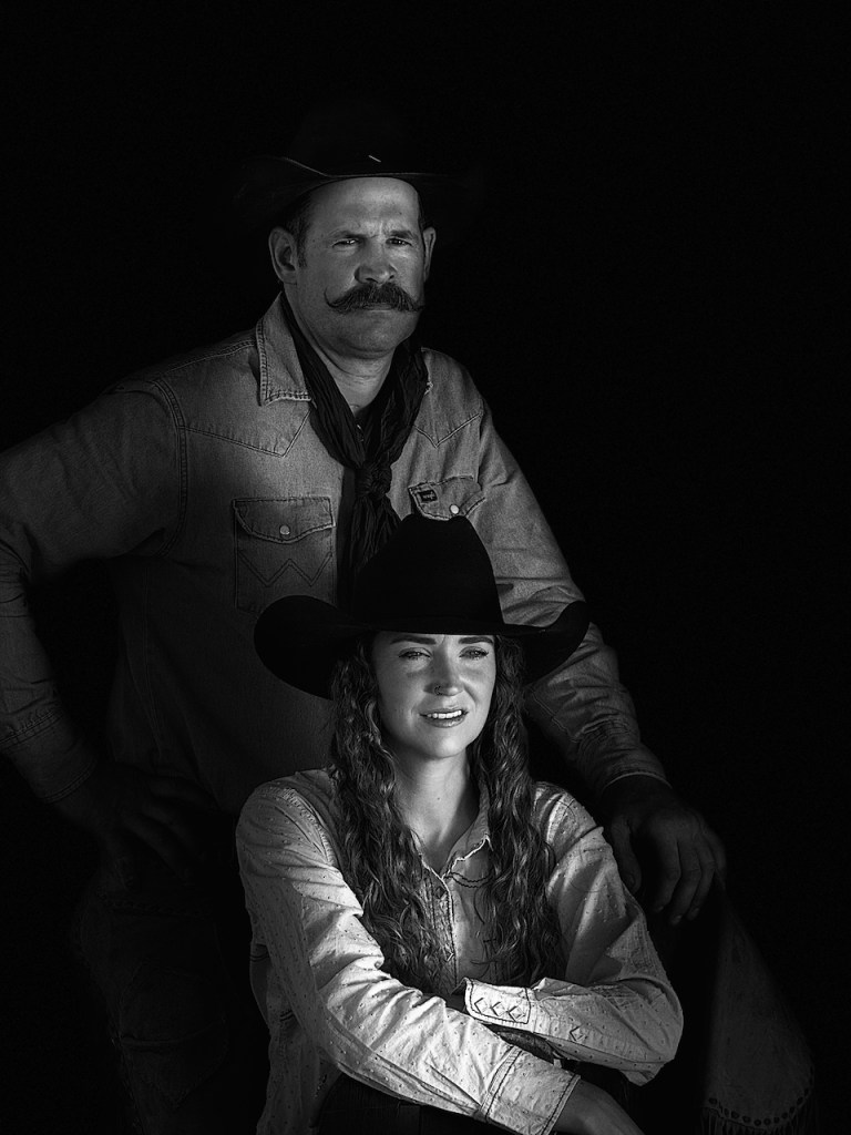 The above and below photos are called Low Key photos where the background is dark and because of the lighting some parts of the person is also in shadow. In the above photo of the cowgirl with the white background this is called High Key where the background is over exposed.