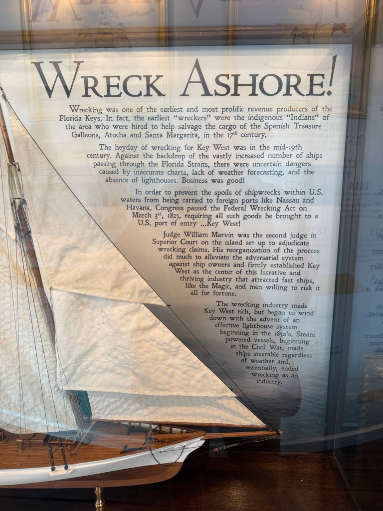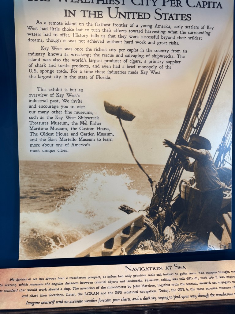 Are you ready to learn some things you probably never heard of? At one time in the mid 1800s, Key West was the most wealthy city in the United States. Part of this was due the cigar factories we already learned about and the second and most lucrative was the “Wrecking Industry”. Crews would go out to the reef off shore and salvage the cargoes of ships smashed on the reef. I am going to let the museum information boards explain all of this to you. You probably need a computer screen to read them.