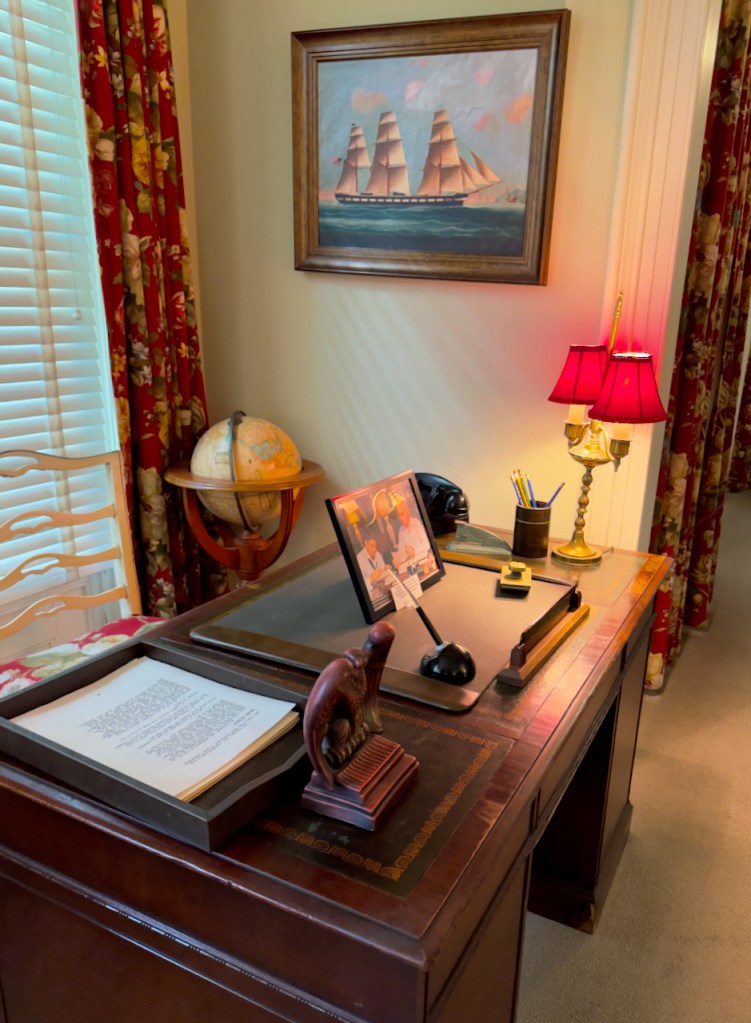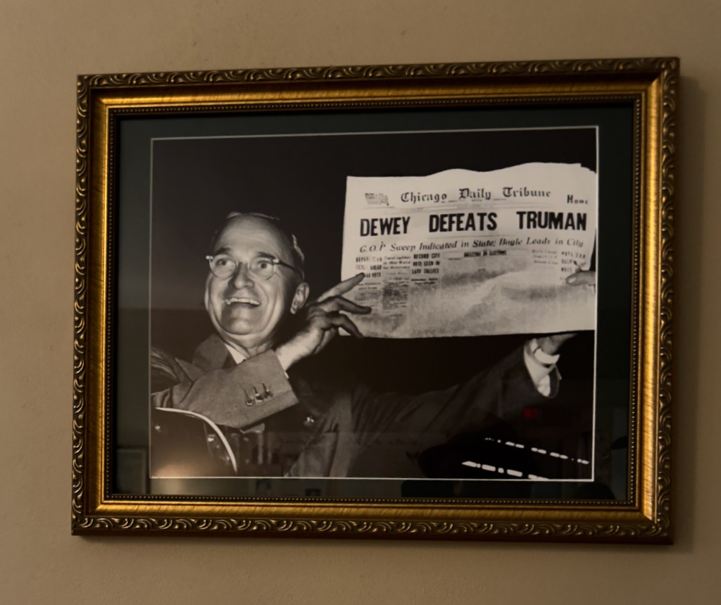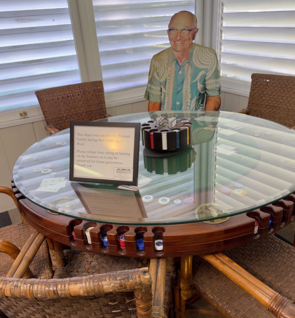 The next morning I took the guided tour through the Harry Truman Little White House, which has a fascinating presidential history of the late 1940’s and early 1950’s. Truman loved to play poker and this is his specially built table. We also see the famous erroneous newspaper headline declaring that Dewey beat Truman in the 1950 election – which he did not. This was his desk with the famous plaque – “The buck stops here”.