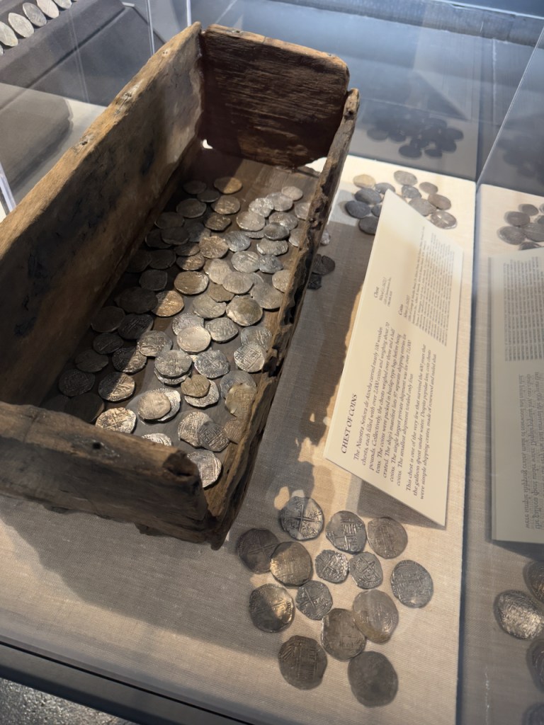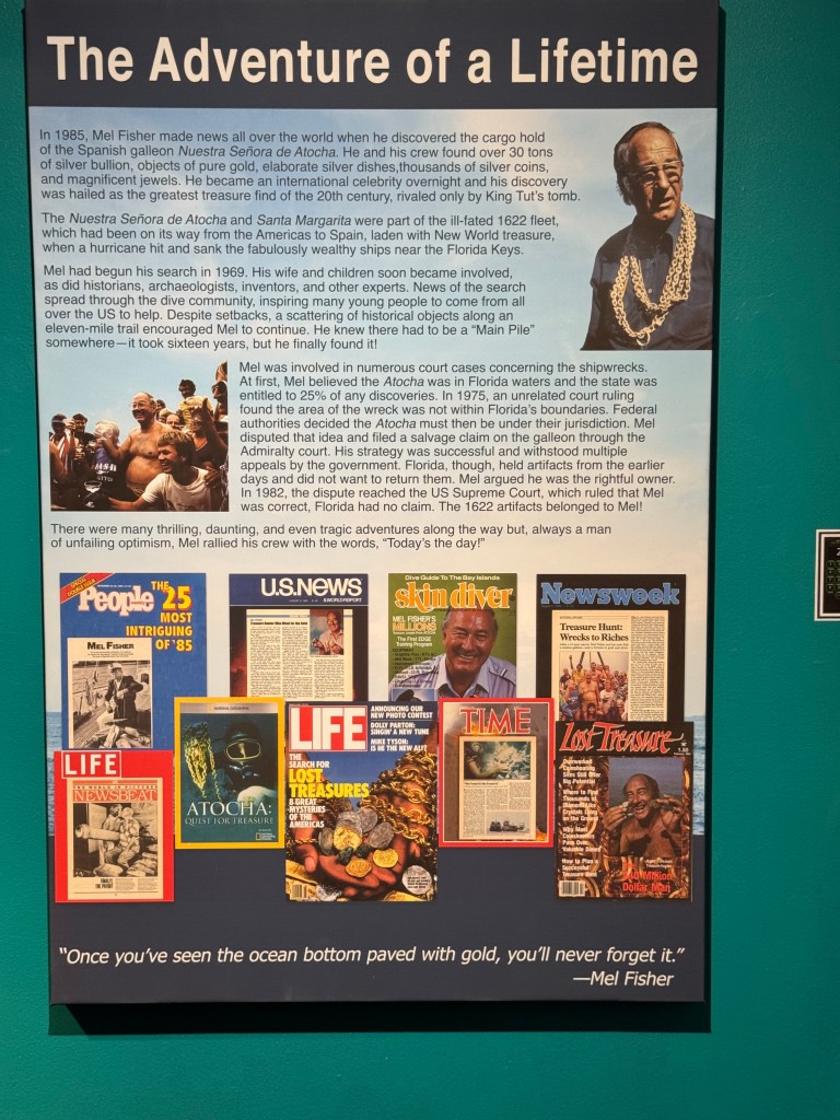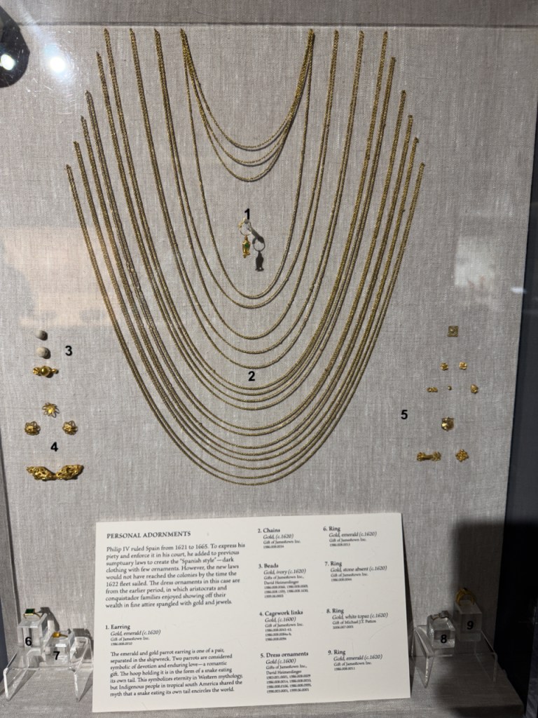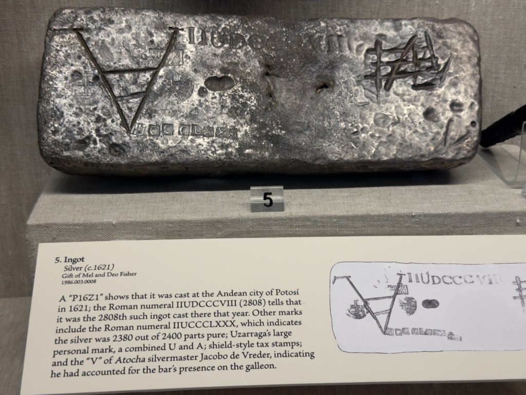 The following are just a few of the artifacts in the Mel Fisher museum. A cannon from the ship, silver coins found in encrusted clumps, heavy silver bars, fine gold artifacts such as this crucifix, intricate gold chains, and crude cast gold bars.