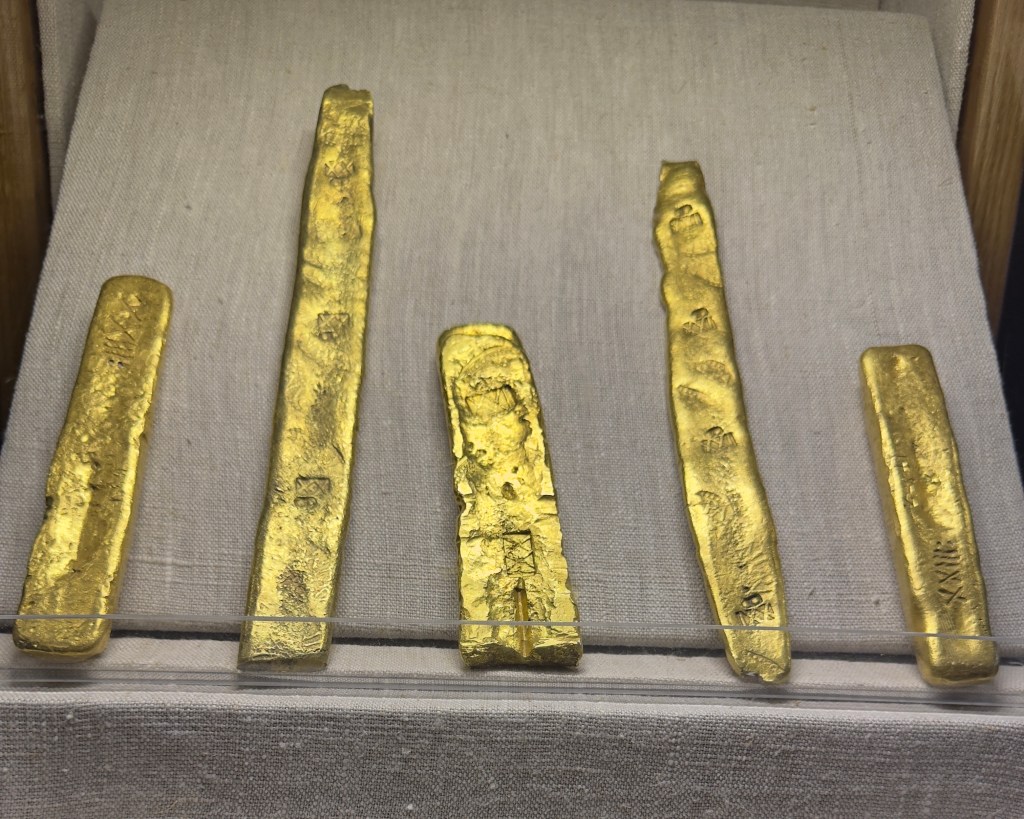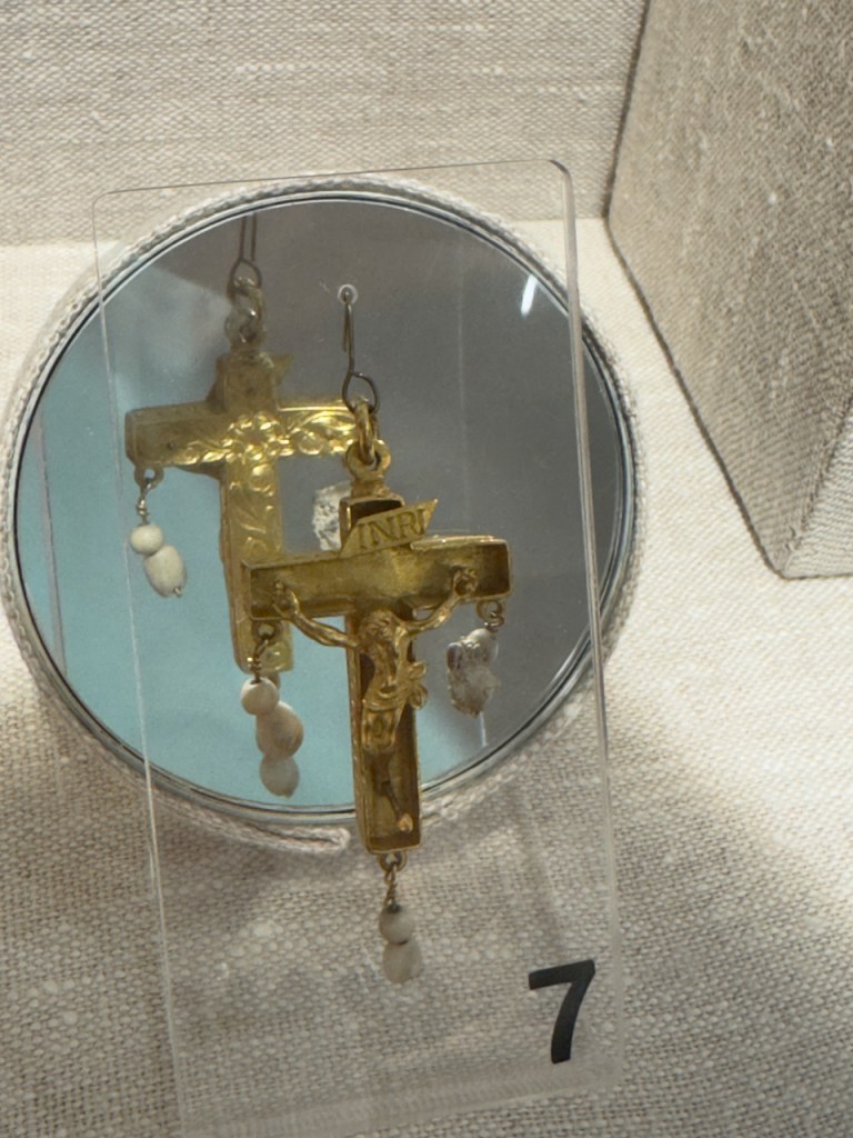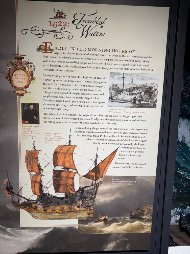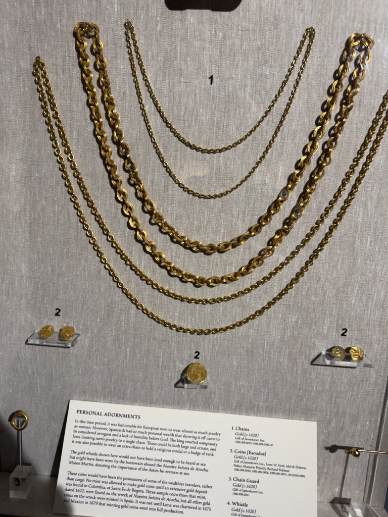 The following are just a few of the artifacts in the Mel Fisher museum. A cannon from the ship, silver coins found in encrusted clumps, heavy silver bars, fine gold artifacts such as this crucifix, intricate gold chains, and crude cast gold bars.