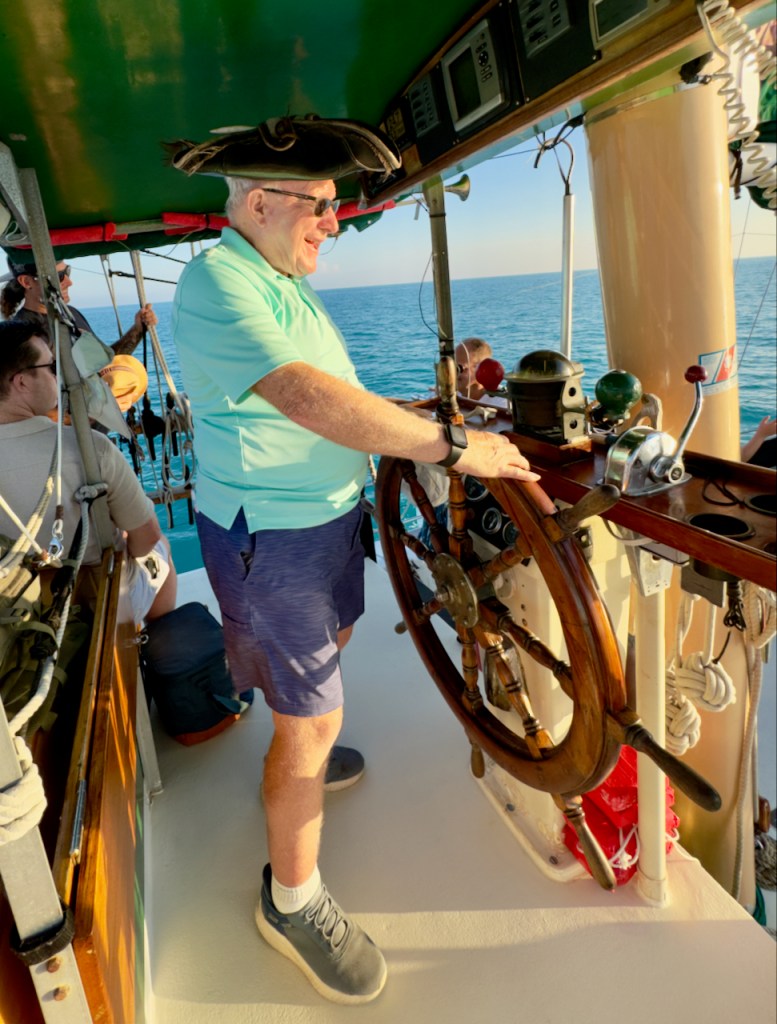 In the afternoon I had one of the best sails of my life on the America 2 which is a replica of the America Schooner that won the inaugural America Cup race in 1851. Its sleek lines, innovative design, and unmatched speed allowed it to outpace the British yachts. I got a chance to experience the speed of 10-11 knots (close to mph) and at times the splashing of water over the deck. You can tell by the masts that she was canted over 10-15 degrees. And what a thrill for me to take the helm for a brief time! This is what the America 2 looks like in the harbor and under full sail.