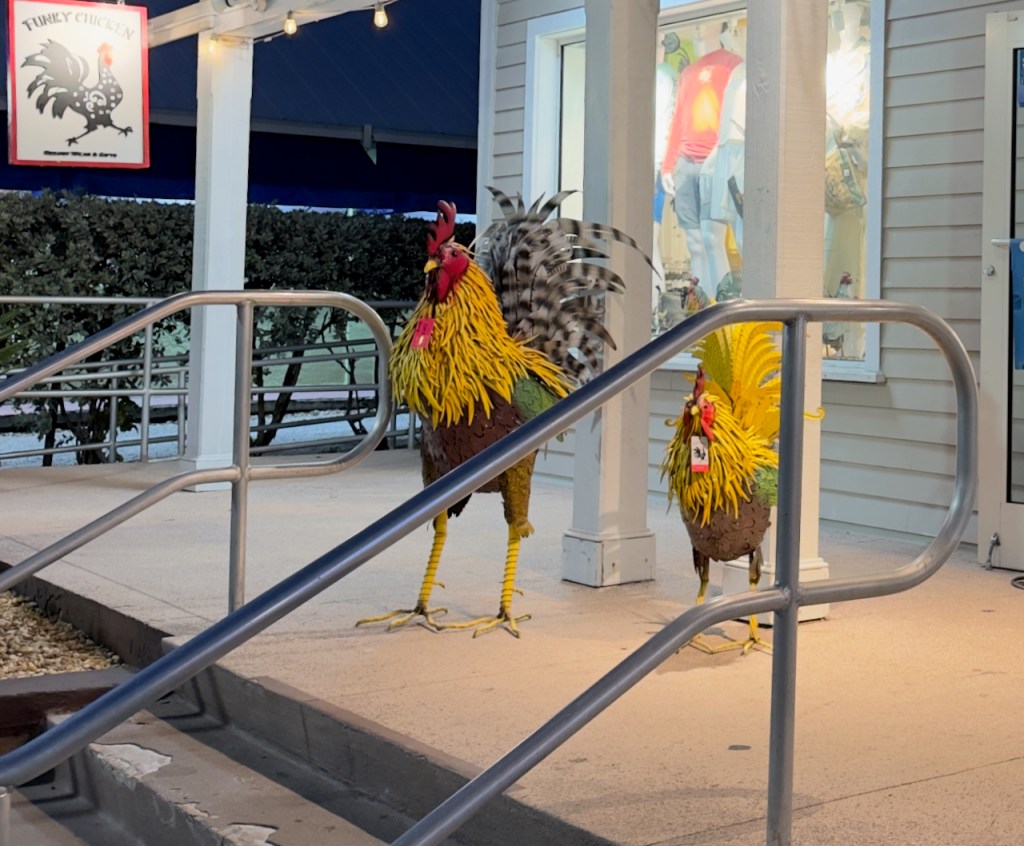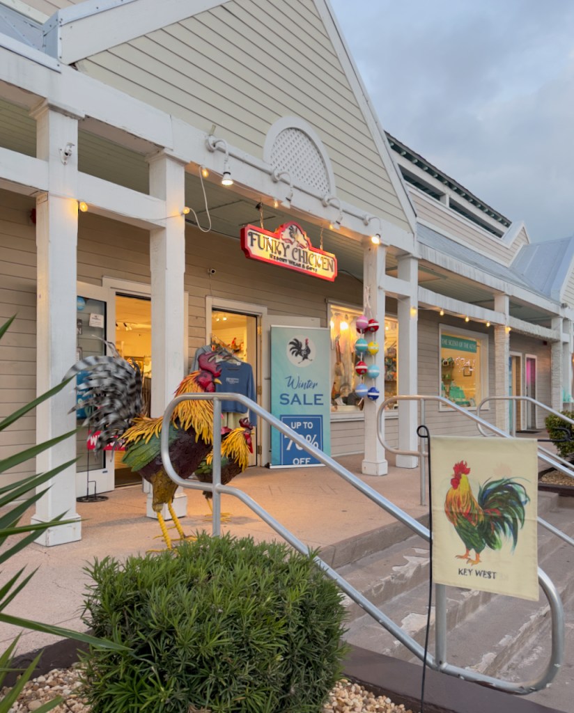 This store, Funky Chicken, pays homage to the many chickens and roosters running around.
